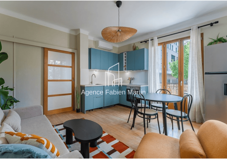 Équipements complets (four/plaques, lave-linge, rangements) et proximité tram C, commerces et quais.